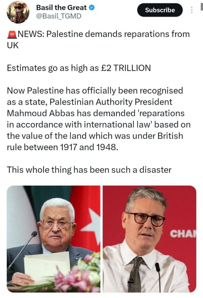 نه. حالا که به رسمیت شناخته شده اومده بابت زمانی که این زمین بین سالهای ۱۹۱۷ تا ۱۹۴۸ تحت سلطه انگلیس بوده ۲ تریلیون پوند ازشون درخواست غرامت کرده. راهبری نوشته شکارچی: خزانه موشکهای پدافندی ناتو در جنگ 12 روزه خالی شد نخست وزیر نتانیاهو در سخنرانی خود در مجمع عمومی سازمان ملل تروریستهای حماس را خطاب قرار داد و گفت: