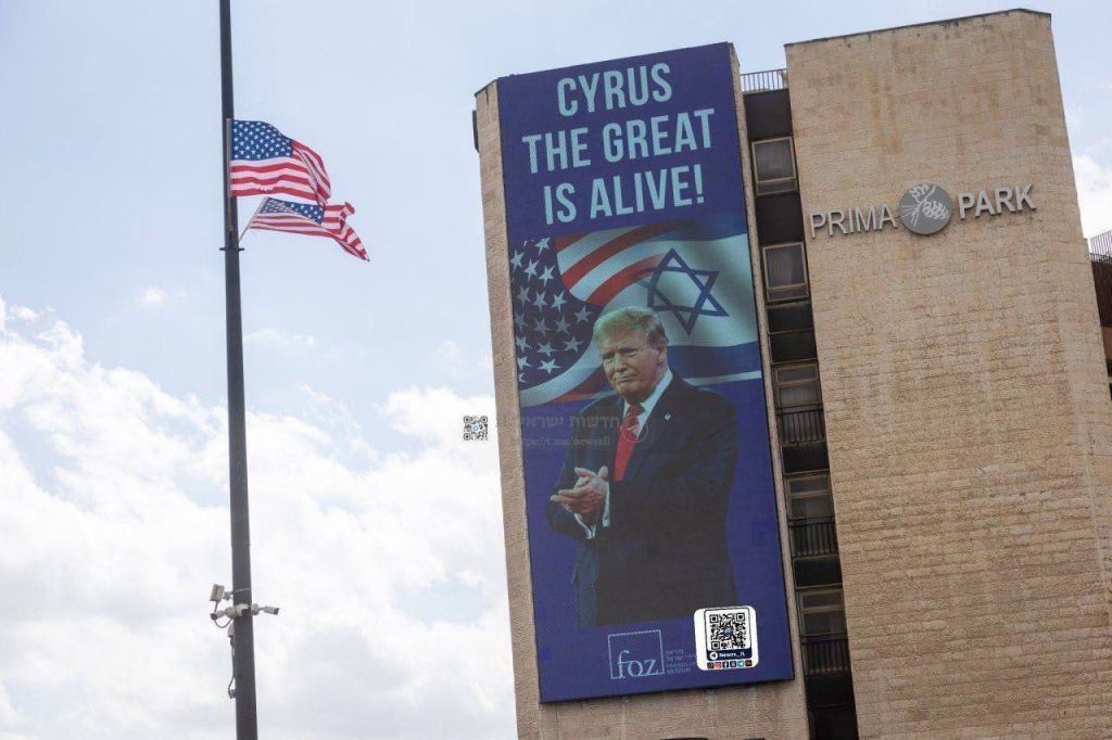در اسراییل برای قدردانی از ترامپ به خاطر تلاش برای آزادسازی گروگانها از دست حماس، تصویر بزرگی از او نصب کرده و بالای آن نوشتهاند: کوروش بزرگ زنده است.