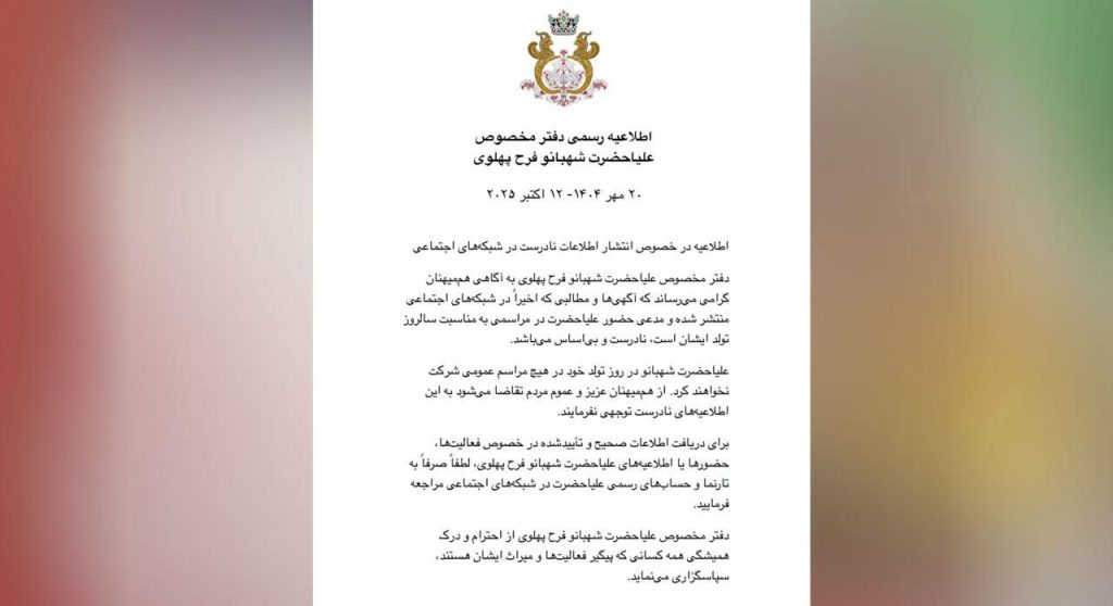 دفتر مخصوص علیاحضرت شهبانو فرح پهلوی به آگاهی هممیهنان گرامی میرساند که آگهیها و مطالبی که اخیراً در شبکههای اجتماعی منتشر شده و مدعی حضور علیاحضرت در مراسمی به مناسبت سالروز تولد ایشان است، نادرست و بیاساس میباشد.